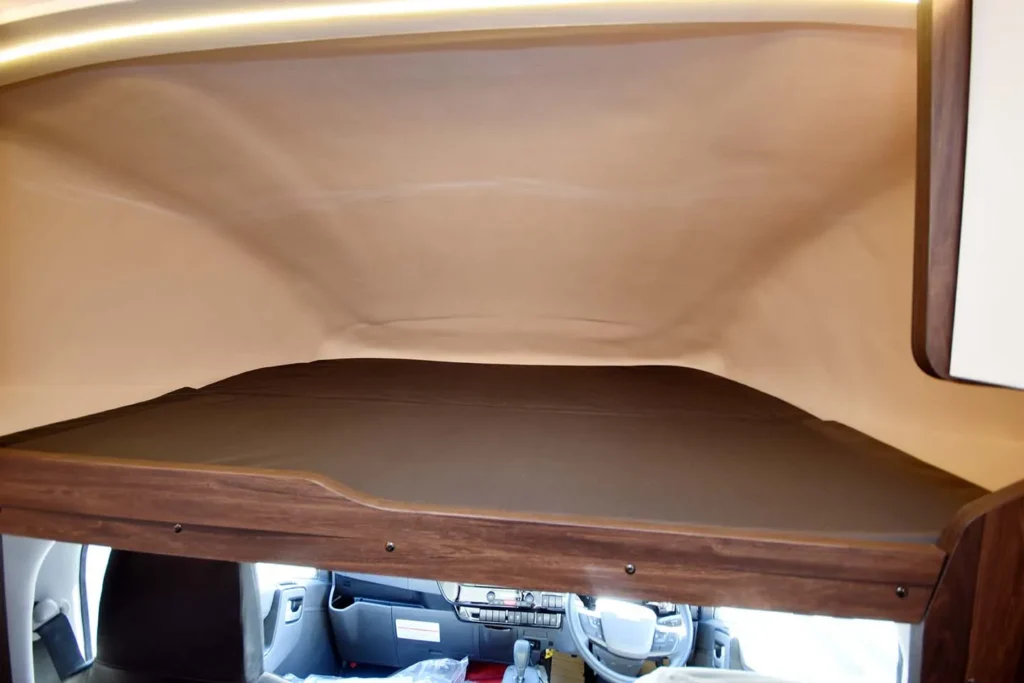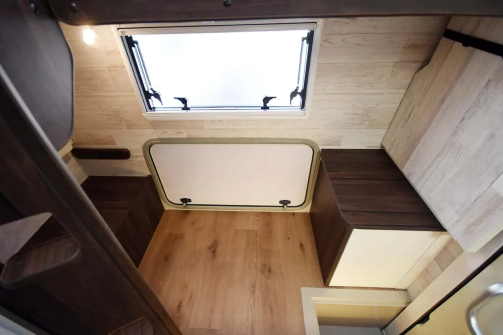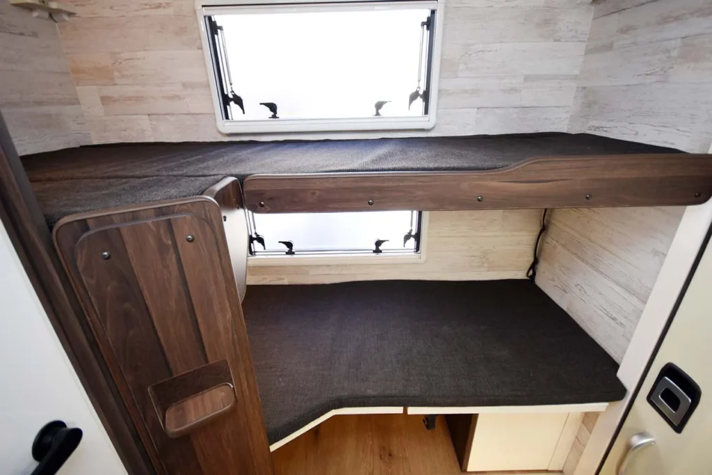 室内は、多人数での使用を想定したゆとりある設計が特長です。ダイネットは6~7名がゆったり座れる空間を確保し、シートをスライドさせるだけで広いフロアベッドへと展開可能。常設のリア2段ベッドやバンクベッドと組み合わせることで、家族利用からグループ、ソロユースまで柔軟に対応します。