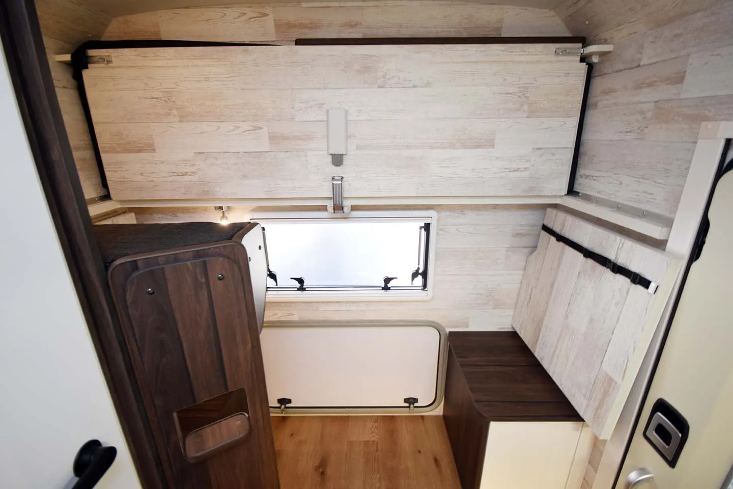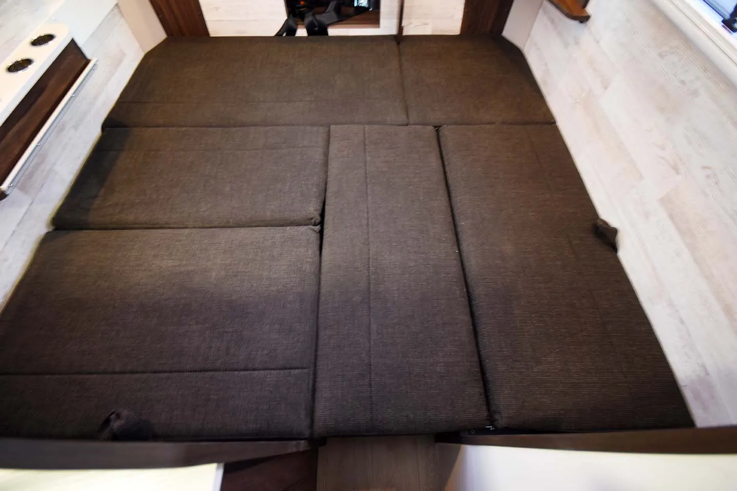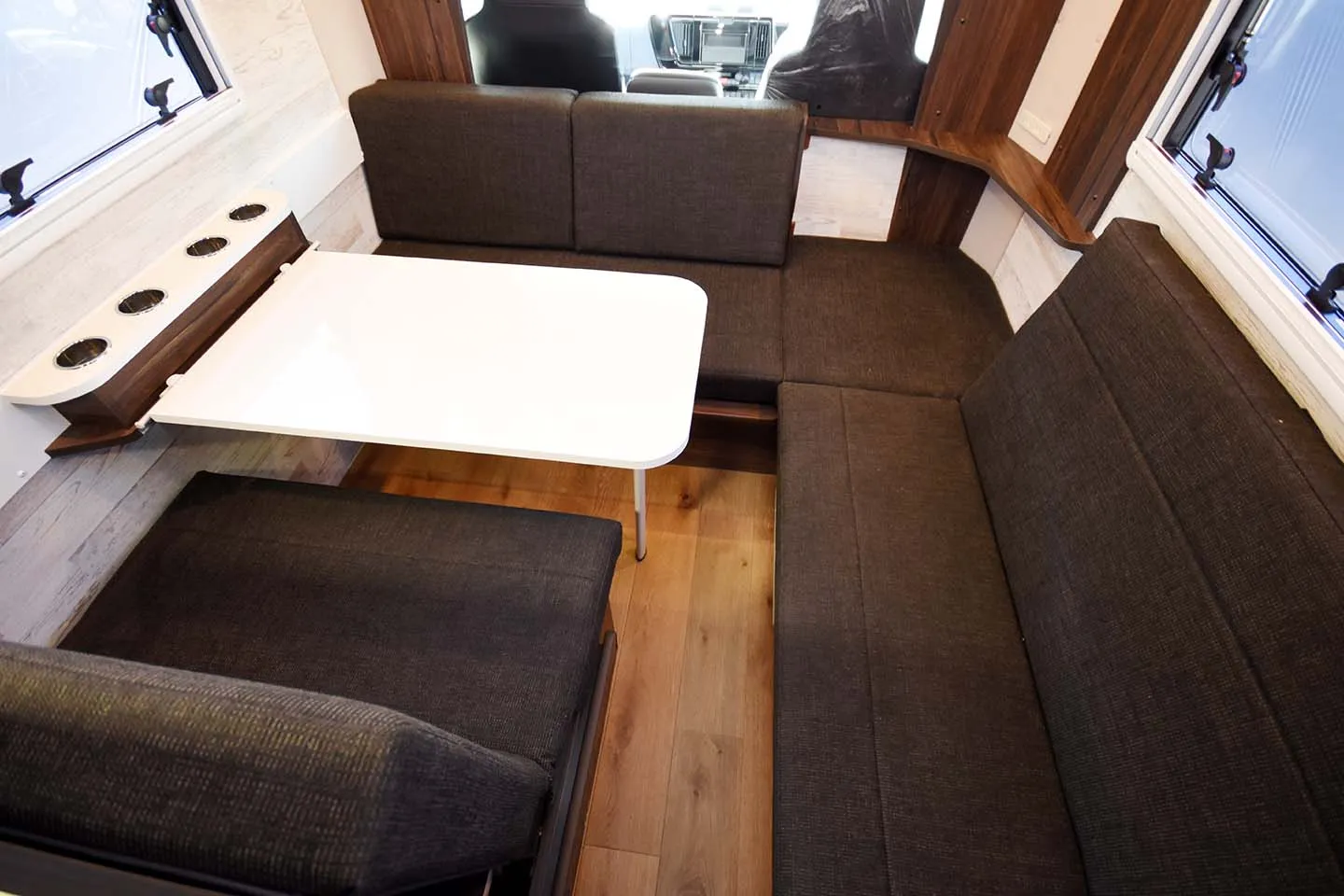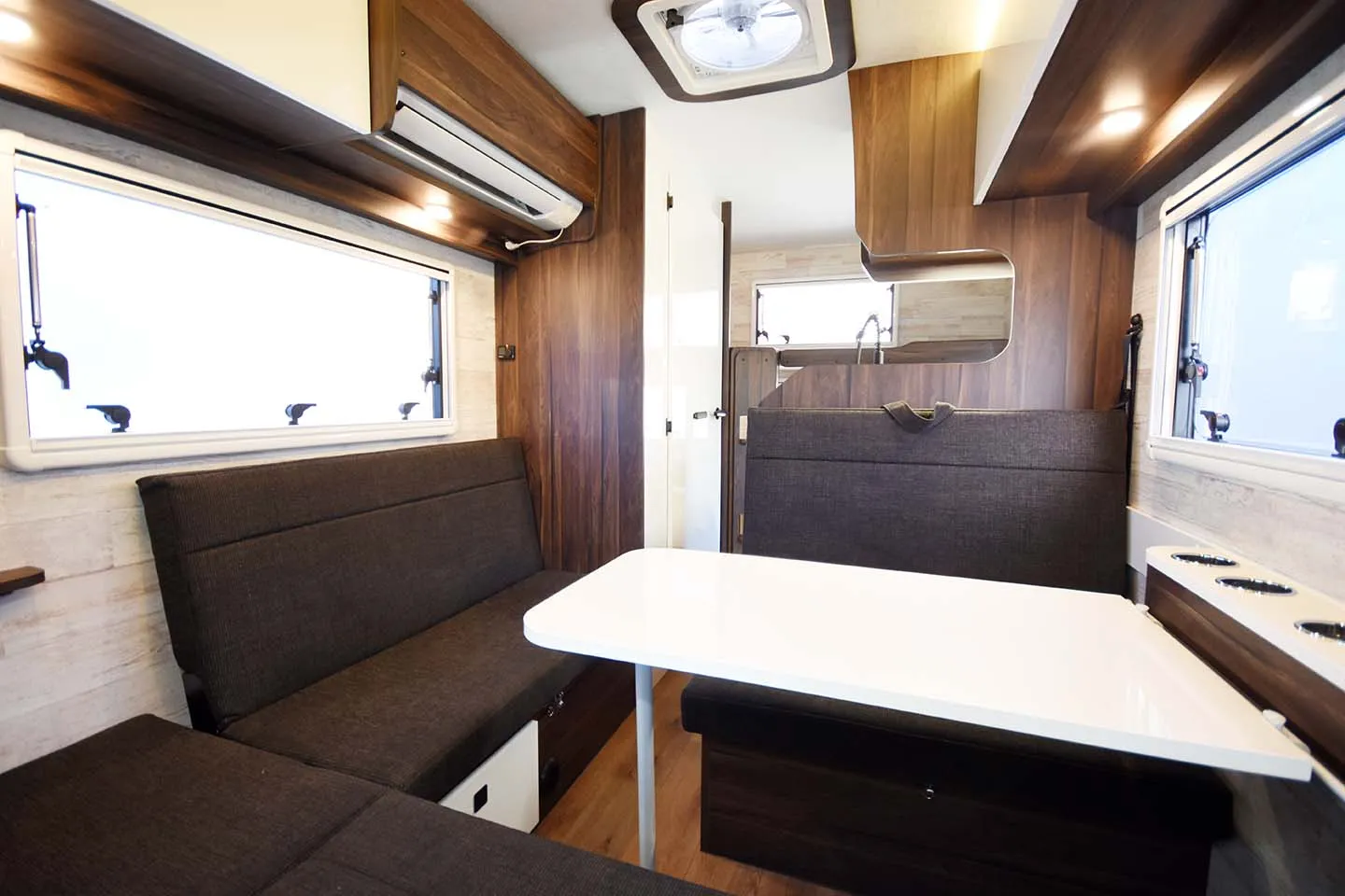 室内は、多人数での使用を想定したゆとりある設計が特長です。ダイネットは6~7名がゆったり座れる空間を確保し、シートをスライドさせるだけで広いフロアベッドへと展開可能。常設のリア2段ベッドやバンクベッドと組み合わせることで、家族利用からグループ、ソロユースまで柔軟に対応します。