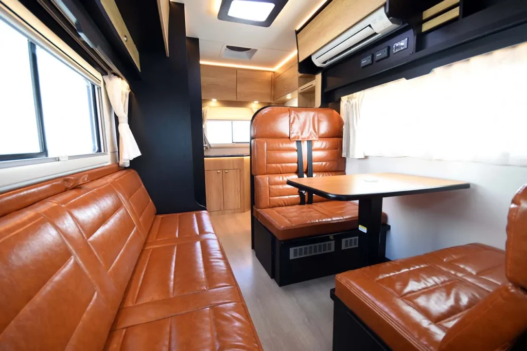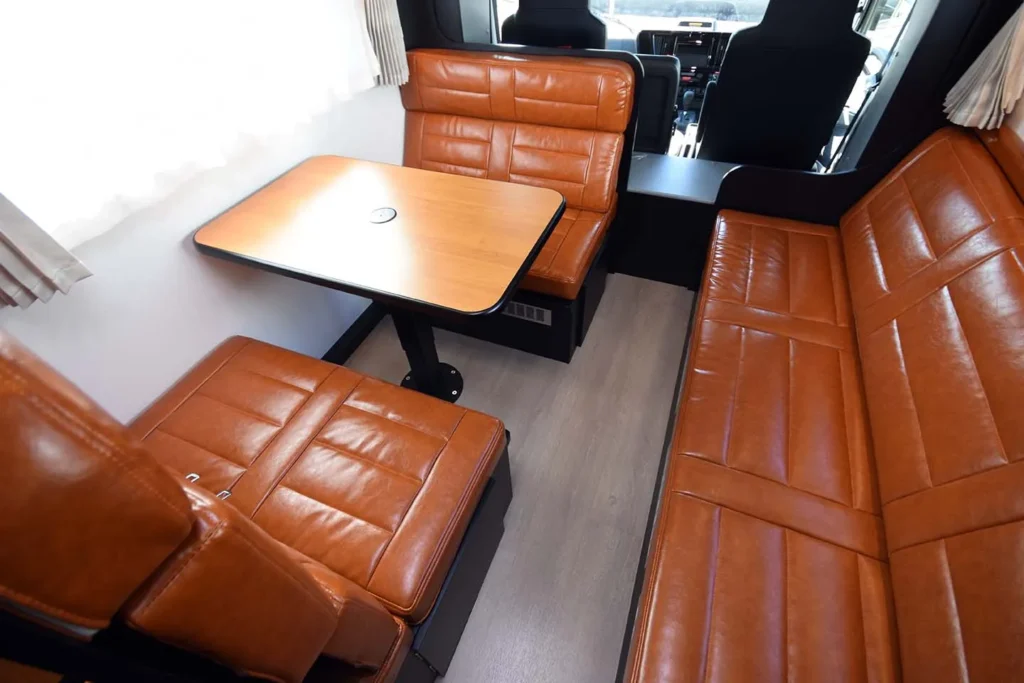 ゆったり座れるベンチソファーを備え、旅先での食事や団らんの時間を快適に楽しめる、落ち着きのあるダイネット空間です。