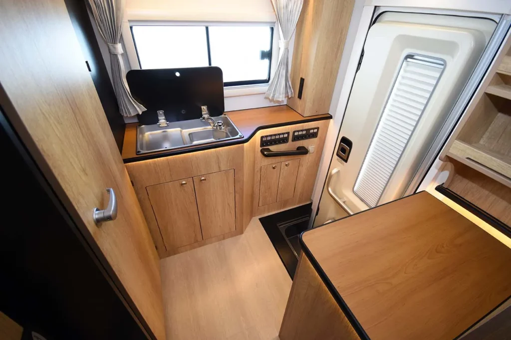 いすゞBe-cam 2.0tハイキャブをベースに、「SAKURA」「AKATSUKI」とは異なる視点から新たに開発された新型キャンピングカーです。