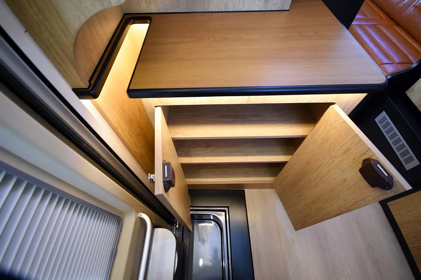 ゆったり座れるベンチソファーを備え、旅先での食事や団らんの時間を快適に楽しめる、落ち着きのあるダイネット空間です。