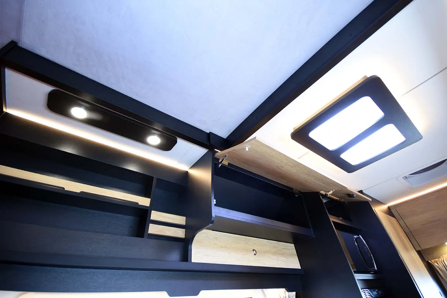 サブバッテリー5kWh(リチウムイオン)/インバーター(2000W)/家庭用エアコン/冷蔵庫/電子レンジ/FFヒーター/ガラス蓋つきシンク/走行充電器/AC外部充電器(外部充電コード付き)/室内100Vコンセント/室内用DCコンバーター/常時後方カメラ・モニター/アクリル2重窓/窓ブラインド網戸/室内LED照明/清水タンク/排水タンク/マルチルーム/遮光仕切りカーテン/バッテリーモニター/他