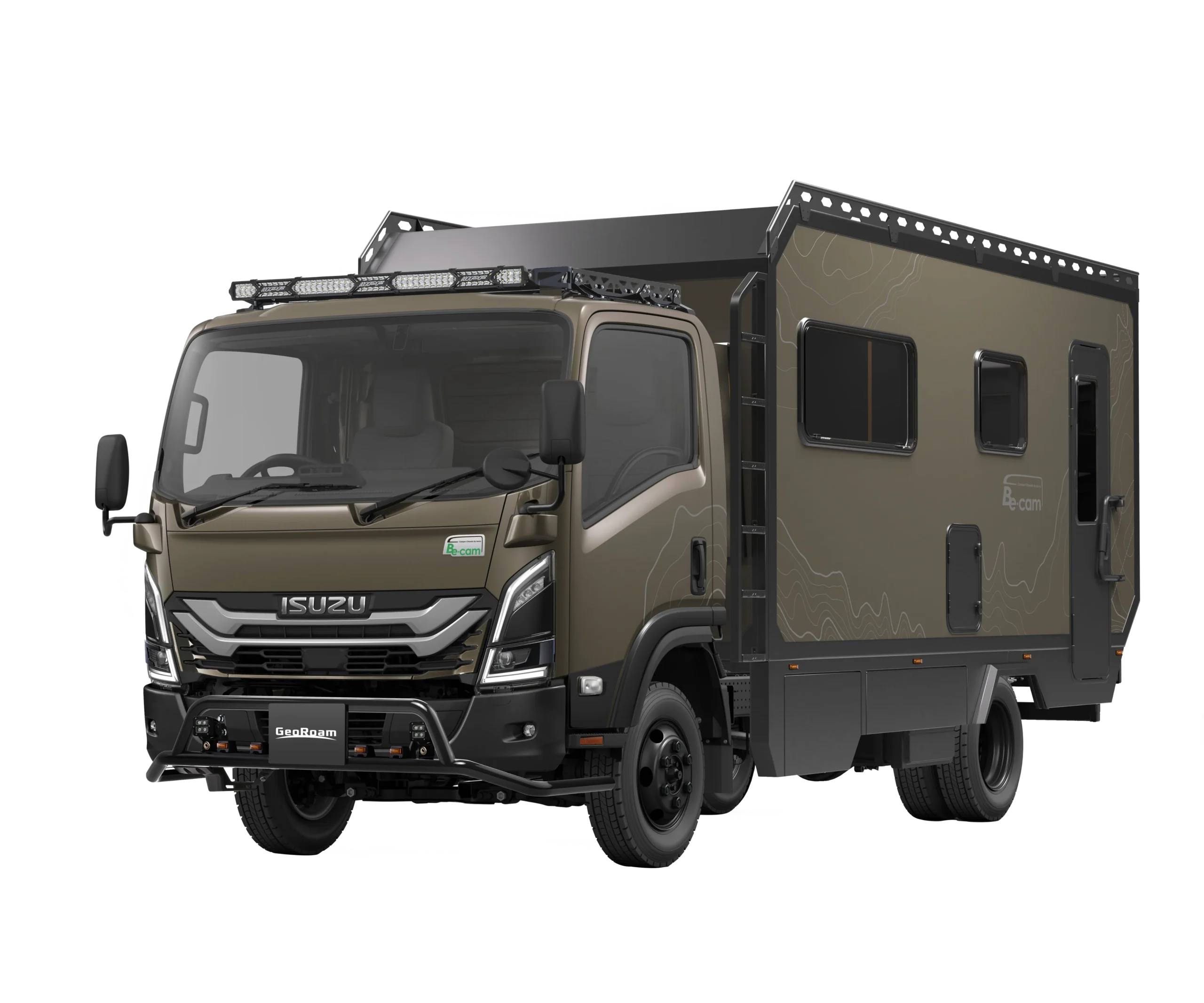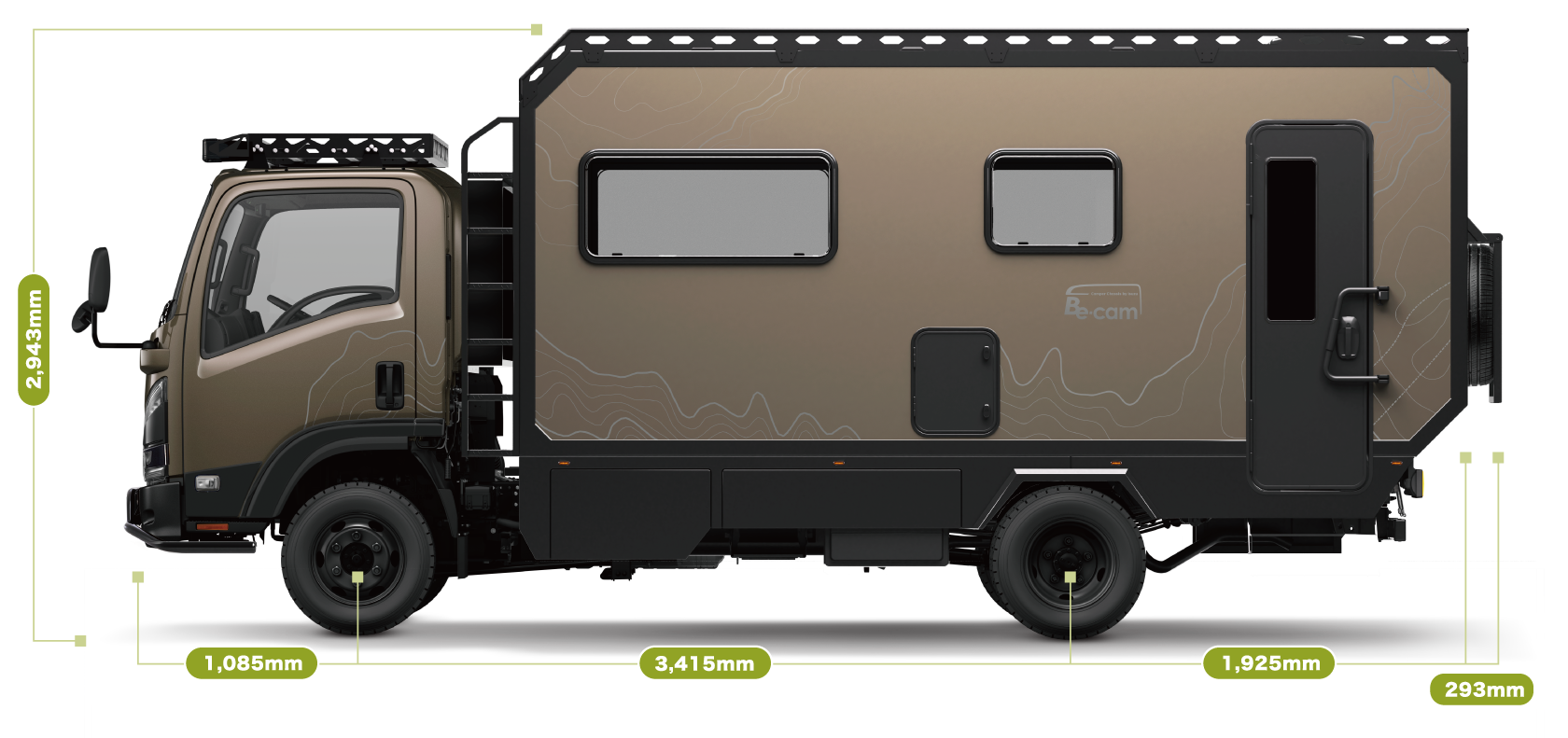 キャンピングカー専用シャシ「Be-cam」をベースに、フルタイム4WDとワイドキャブ、ロングホイールベースを採用。