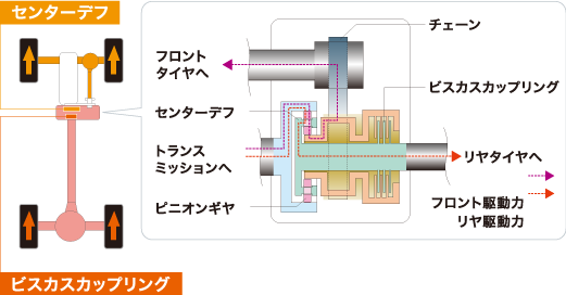 2WD・4WDの切換え操作が不要で、イージードライブを可能にしたフルタイム4WDです。センターデフによりトルク配分を最適化。万一タイヤが空転してしまった場合でもビスカスカップリングがトルク配分をコントロールします。