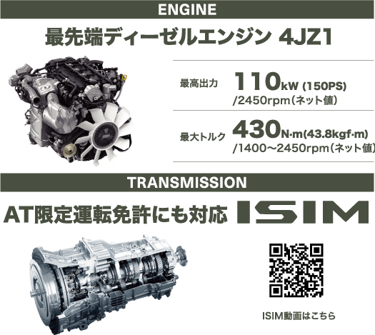 直列4気筒 DOHC 3Lディーゼルターボエンジン「4JZ1-TCS」の力強いトルクといすゞのこだわりを体現する9速DCT 「ISIM(アイシム)」が、卓越した燃費と静かでスムースな走りを実現します。9速に多段化したことで、ギヤ比をよりワイドレンジ・クロスレシオ化。エンジン回転上昇を抑えた早めの自動変速で、高次元で燃費と動力性能を両立します。