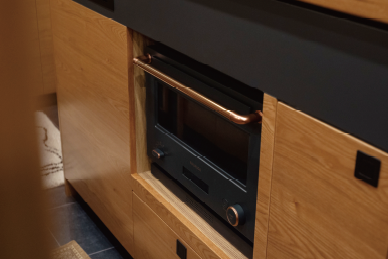 コンロやシンク、電子レンジを完備した、モダンな雰囲気と機能性を