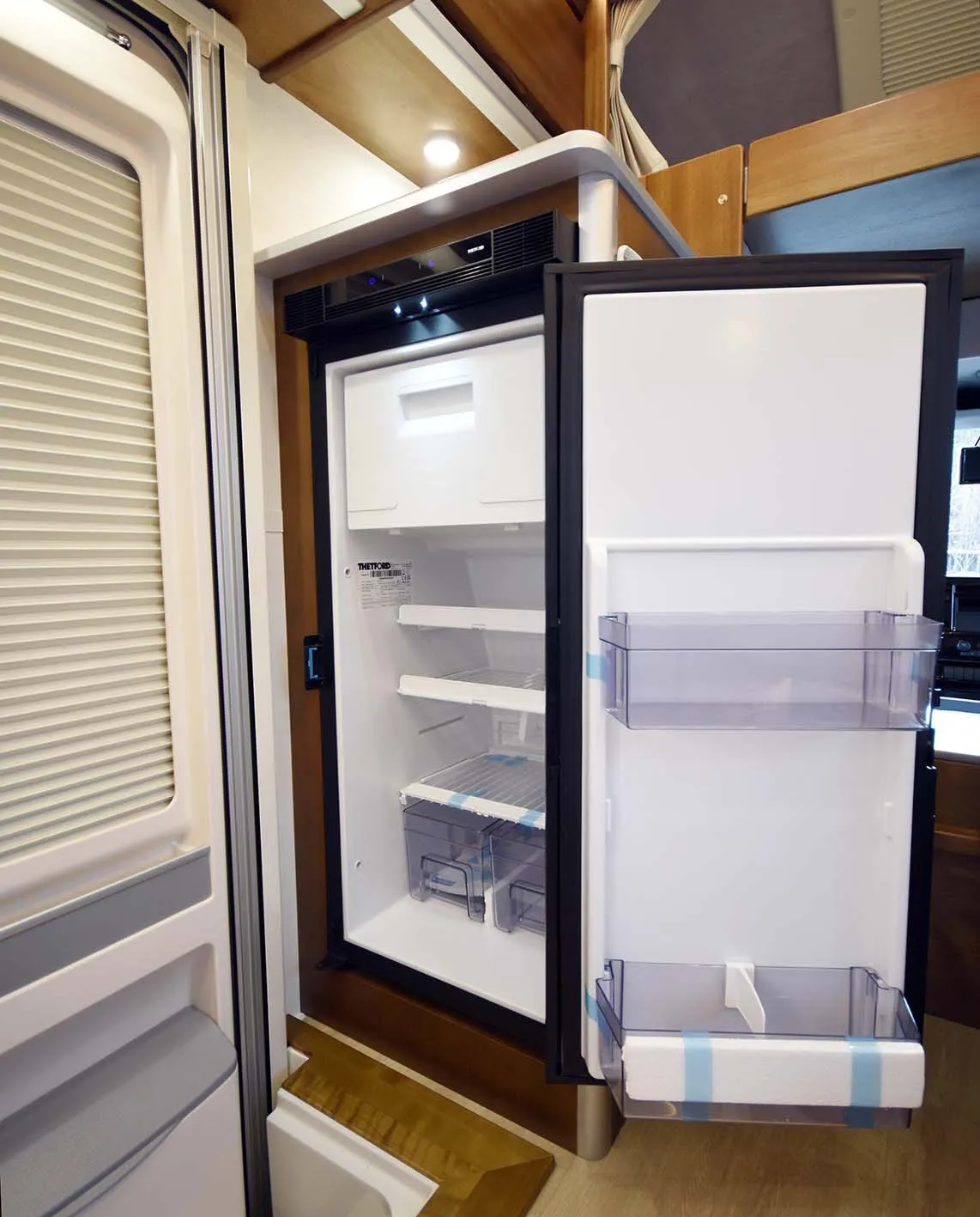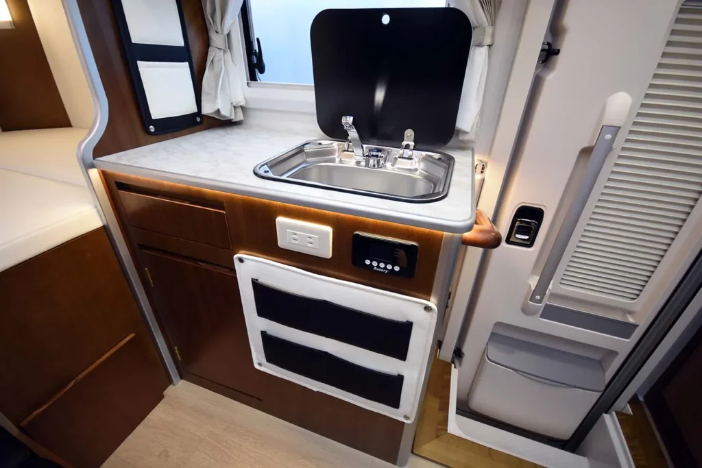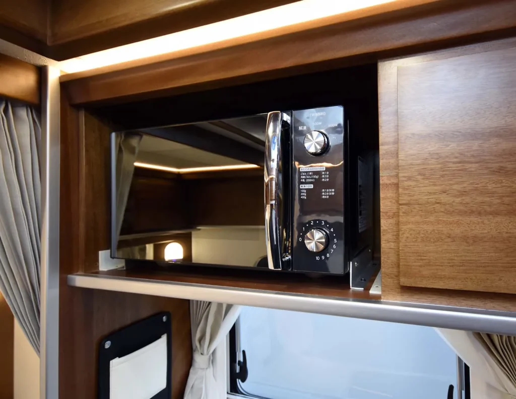 常設ベッドの下部や車体後部には、大型バゲッジドアを備え、アウトドア用品や長期滞在時の荷物も効率よく収納可能。ダイネットは展開せずそのまま休憩スペースとしても使え、シーンに応じた柔軟なレイアウトが可能です。ギャレーにはガラスカバー付きシンクや電子レンジを配置し、日常的な調理から旅先での簡単な食事まで幅広く対応します。