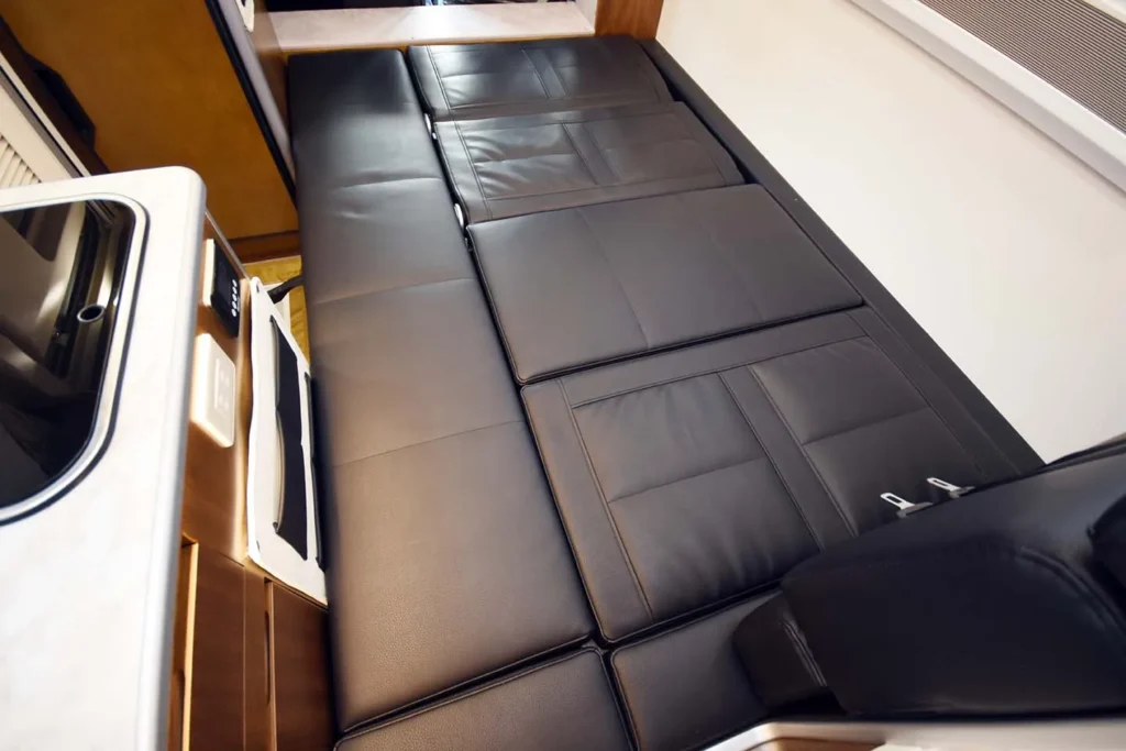 あえてマルチルームを省き、リヤ空間を大胆に再設計することで、広々とした常設クイーンサイズのリヤベッドを実現。展開の手間なく、いつでもゆったりとした就寝環境を確保できます。