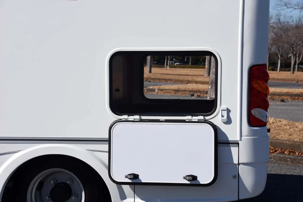 家庭用エアコン、FFヒーター、リチウムイオンサブバッテリーなどを備え、季節や場所を選ばず快適。 - いすゞTravioベースの安心・安全性能