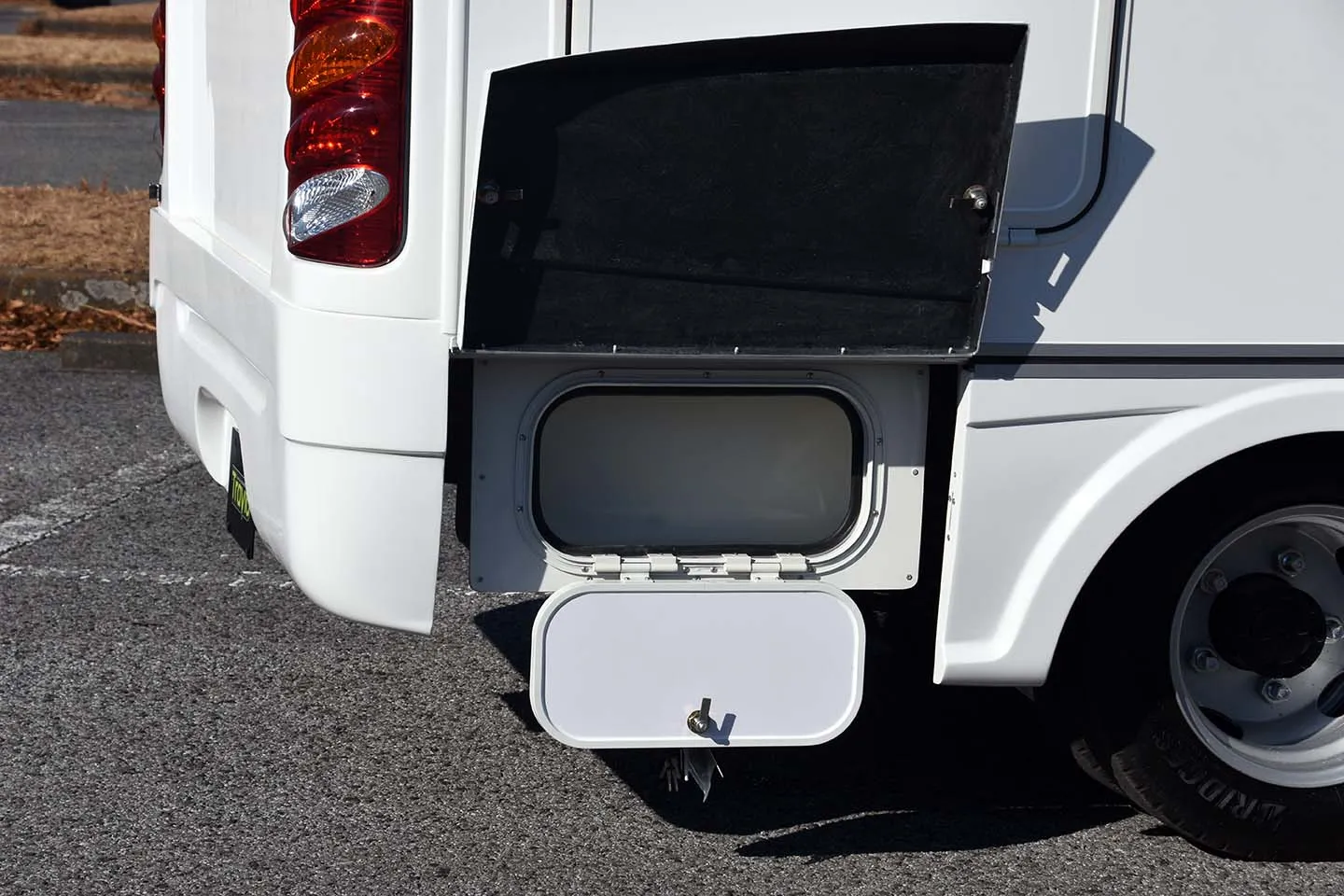 | リヤ・サスペンション | キャンピングカー専用設計テーパーリーフサスペンション・スタビライザー・ショックアブソーバー |